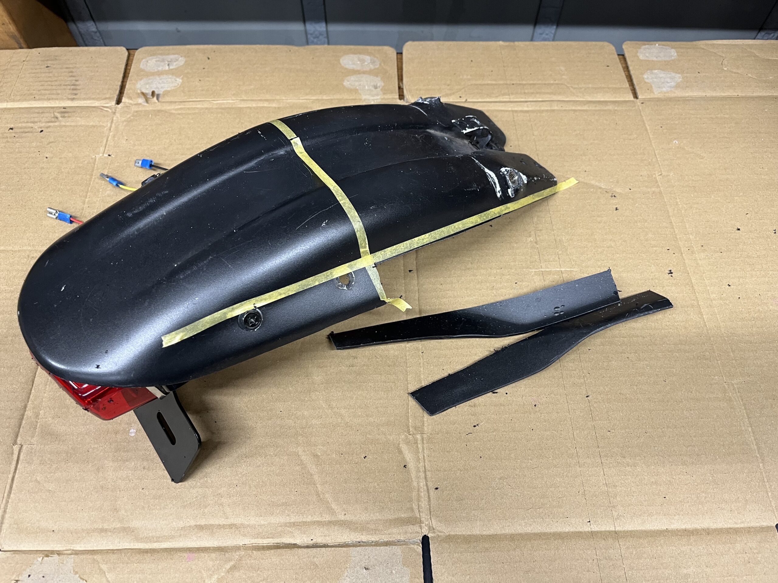 切断位置の打ち合わせ。フェンダーも2点留めでぐらつくので根本にステー追加して4点留めに変更予定